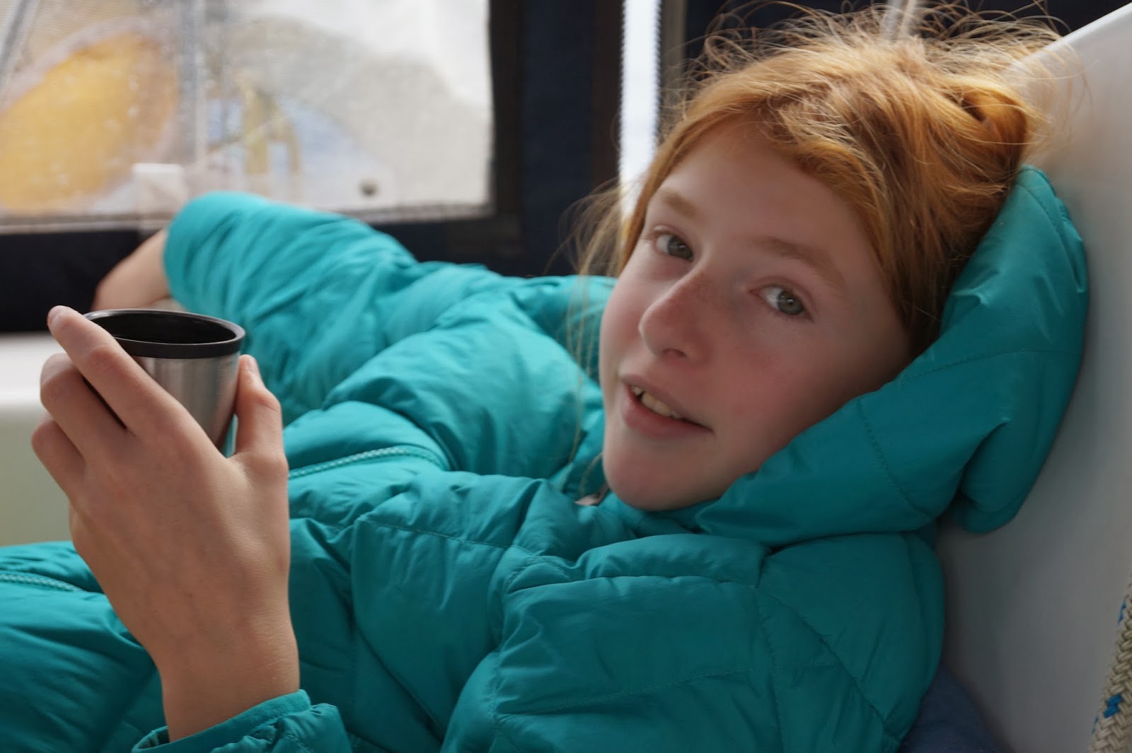 « Autre moment de bonheur il n y a que du bleu tout autour, la ligne de la mer se confond au ciel gris du jour. C’est absolument magnifique .Pendant ma sieste Dave et Isabelle avaient tangonné le génois à contre pour une allure vent arrière. Plus confortable même si la réduction du génois nous fait perdre un peu de vitesse. Demi se sent mieux, elle arrive même à lire, Rebecca, par contre, est encore agenouillée, la tête entre les panneaux de toile du cockpit, au-dessus la plage arrière.