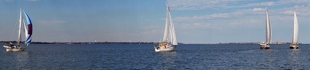 Selon les organisateurs, il faut quitter aujourd'hui (au lieu de la date prévue de demain) afin de passer le courant du Gulf Stream le plus rapidement possible. Cela fait contraste avec tout ce que j'ai lu sur la traversée du Gulf Stream qui recommandait d'éviter les vents du nord de plus de 15 noeuds car la mer peut devenir dangereuse à cause des vagues soulevées par l'effet "vent contre courant". Partir immédiatement est notre seule chance de saisir une belle fenêtre météo d'ici au moins 7 à10 jours. On nous avise que ce sera une traversée "fast and bumby but not dangerous". Et voilà!, les dés sont jetés...le départ de la course est prévu pour 15h00 sur les Hamptons Flats, soit à 2 heures de moteur d’ici vers la sortie de la Chesapeake.