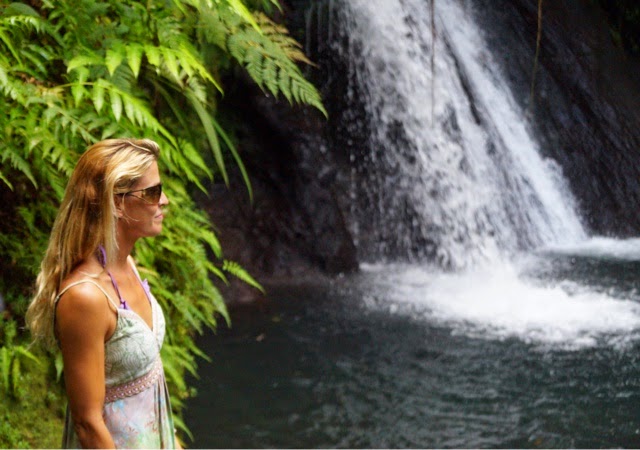 C'est tout de mêmen magnifique ici. Il y a une belle petite chute d'eau, une rivière d'eau douce et une végétation luxuriante. Nous nous trempons les pieds et marchons dans ce cours d'eau. Il y a beaucoup de gens tout autour, mais l'endroit est tout de même paisible.